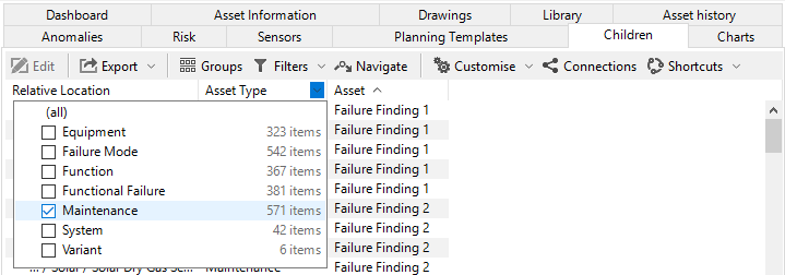 If required, you can filter your assets. For example, you can filter your assets based on the asset type in the Asset Type column:
